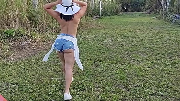 Bruneta fututa in aer liber de un batran care ejaculeaza pe corpul ei